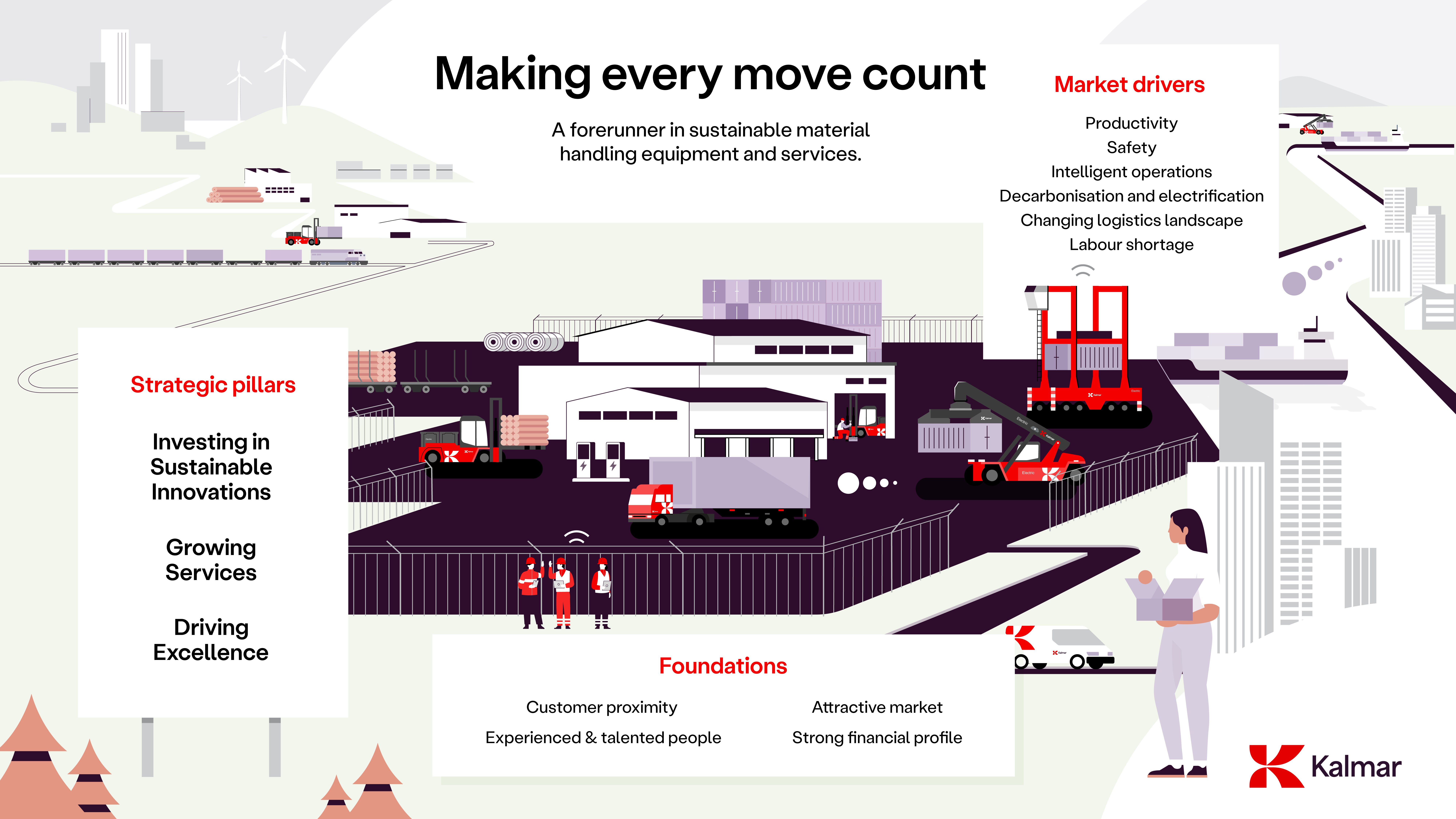 Logistikbranschen förändras för att möta utmaningarna i vår värld. Kalmar ligger i framkant av denna omvandling. Med vår globala räckvidd driver vi hållbar materialhantering, skapar värde för våra aktieägare och hjälper våra kunder att förbättra sin säkerhet, hållbarhet och produktivitet. Tillsammans får vi varje rörelse att räknas.