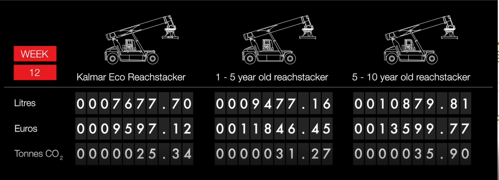 Jämfört med äldre reachstackers kan vår miljöeffektiva lösning minska er bränsleförbrukning med upp till 40 % och med upp till 25 % jämfört med nyare maskiner. Det minskar era bränslekostnader och utsläpp samtidigt som är lika produktiv som maskiner med mycket större motorer . Detta styrker vår Kalmar Eco Reachsacker bränslebesparings garanti.