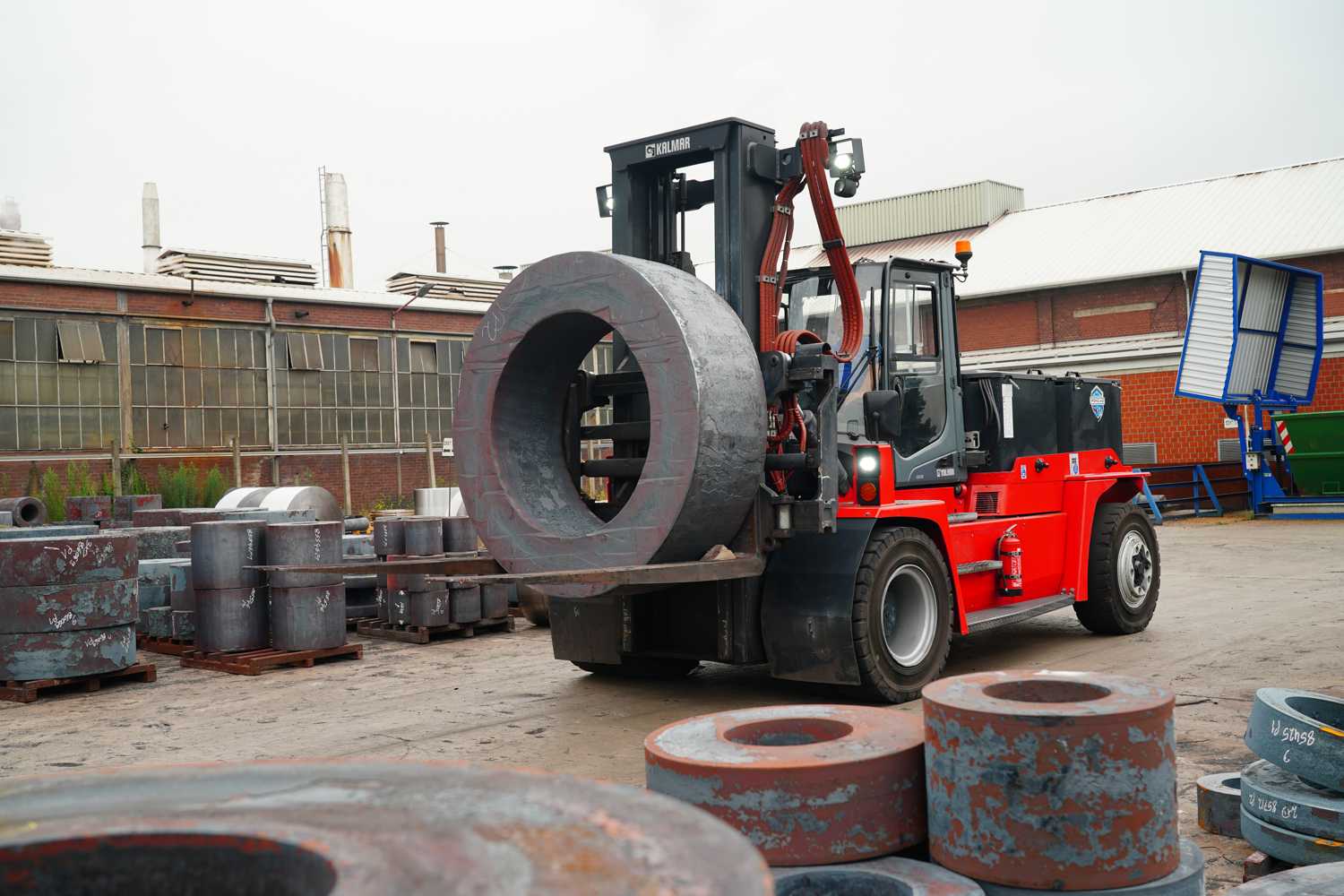 The forklift fleet consists of 22 units, most of which have a load capacity of 5,000 kg. In 2012, the decision was made to equip the medium forklifts with electric drives. Kalmar is the supplier for the high-powered 8,000 and 16,000 kg payload electric forklifts from the current ECG series, which covers a payload range from 8,000 to 18,000 kg.
